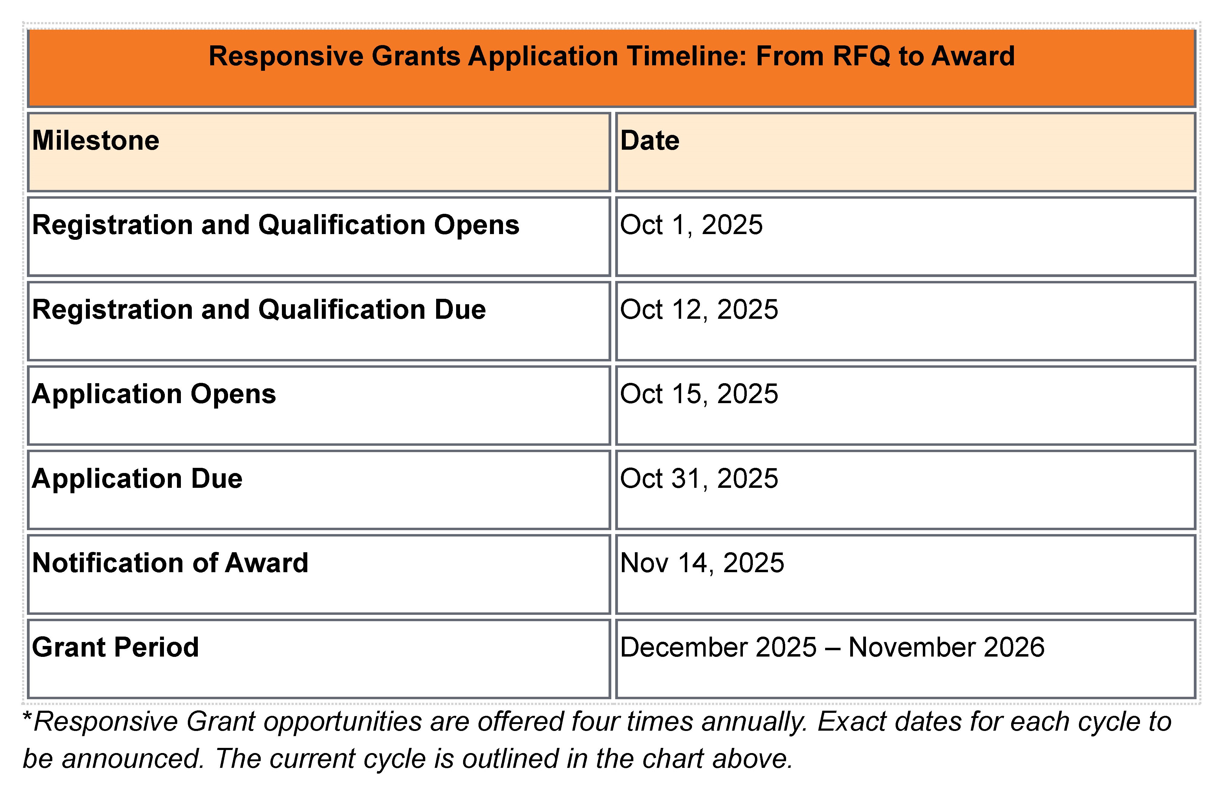 - Short-Term Responsive Grants: Up to $15,000 for one-time costs like technology, equipment, training, or events that meet immediate community needs.